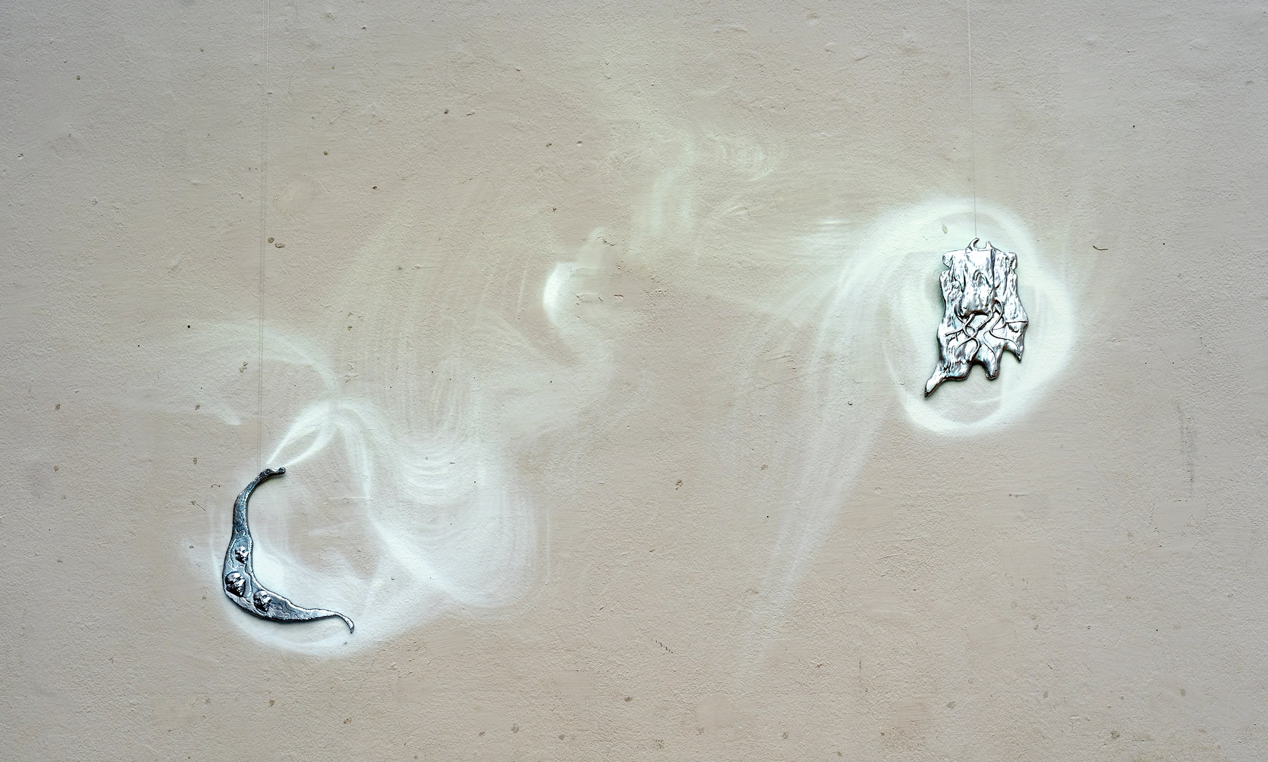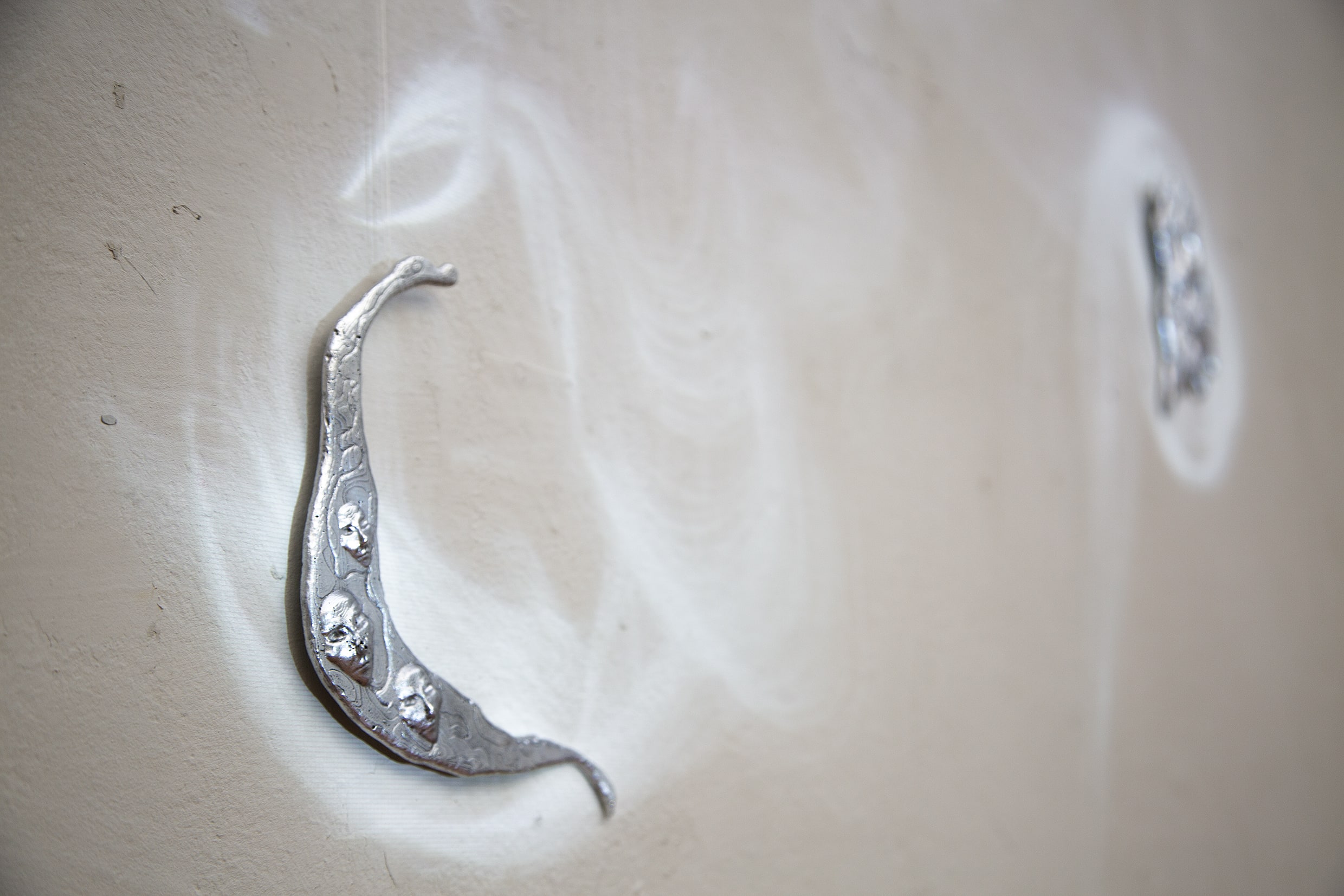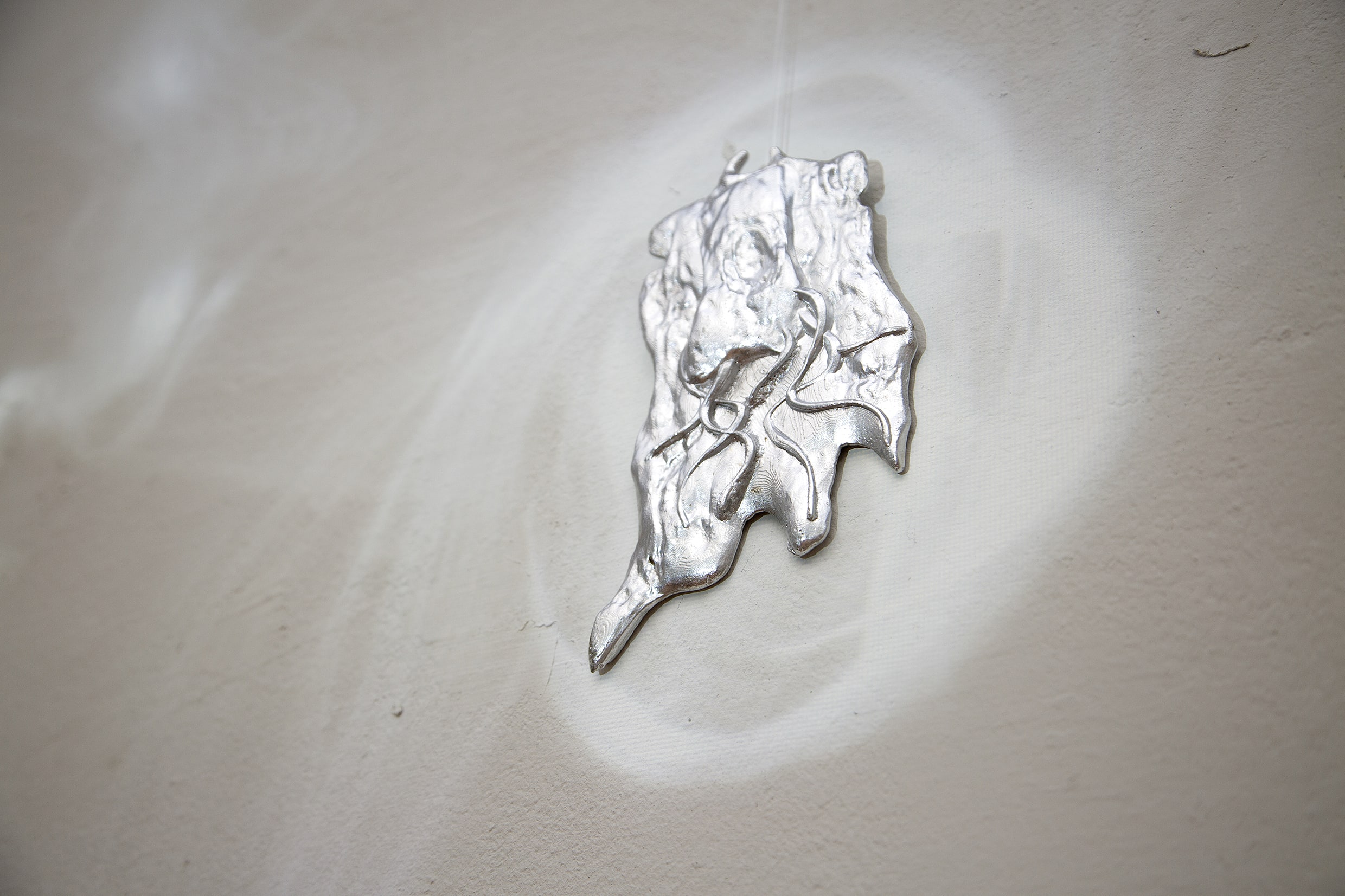 By the roots of Yggdrasil, the great ash tree in the centre of the world, Urd, Verdandi and Skuld spin the destinies of every human and God, thereby making them more powerful than almost any other creature in mythology. The two reliefs in the installation, casted in metal as a tribute to the leftovers of original viking art, are the artists visual interpretation of the story told in the Edda poems. Digitally spun thread is connecting the metal objects and weaving the historic myth into a present context where female powers are allowed to outshine heroic battlefield tales.