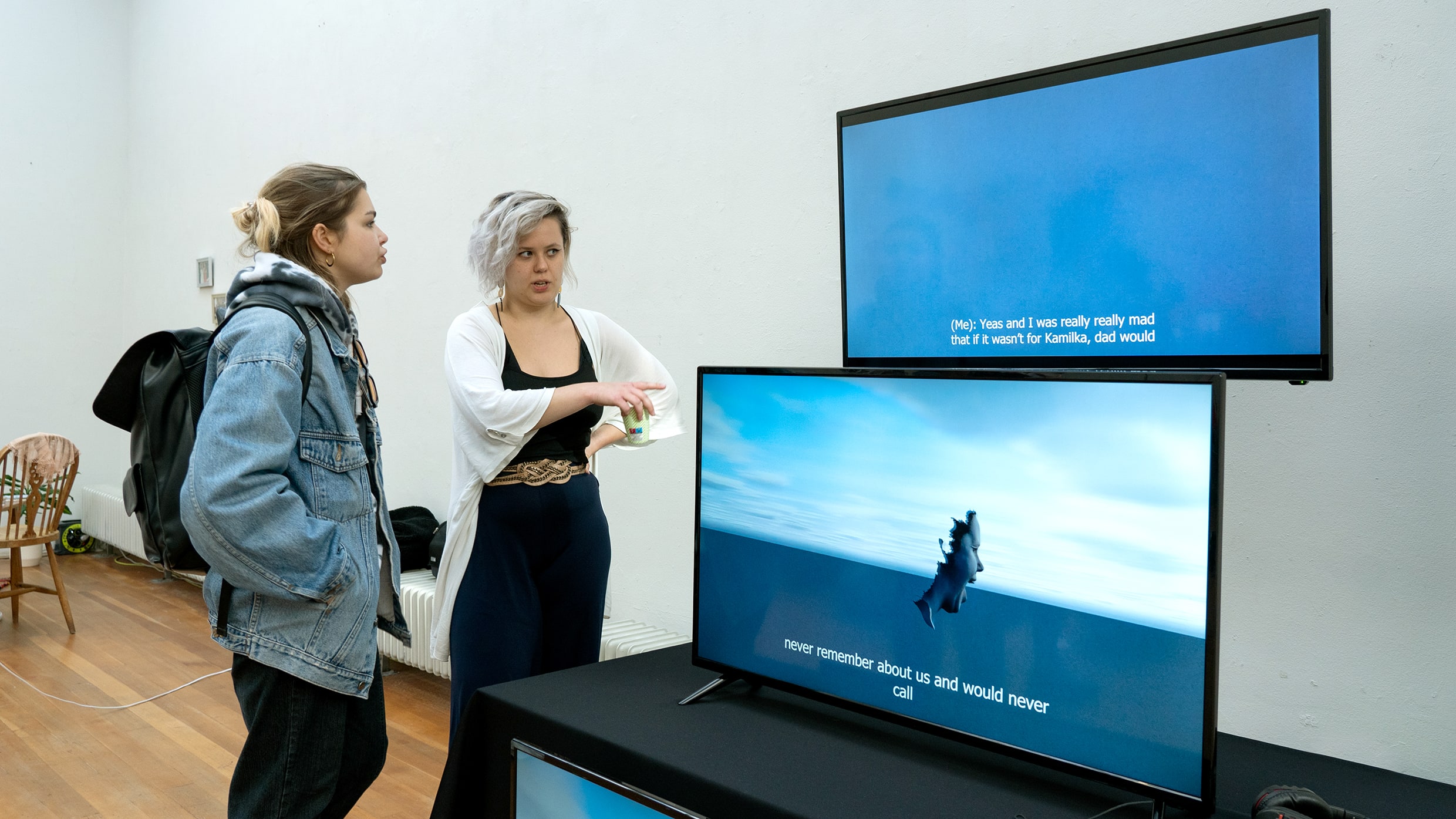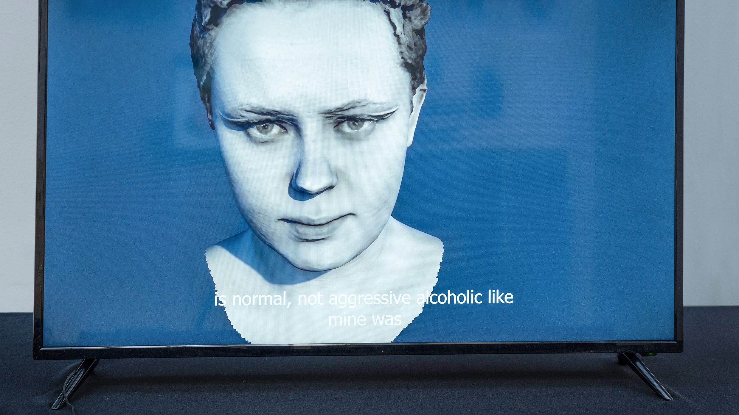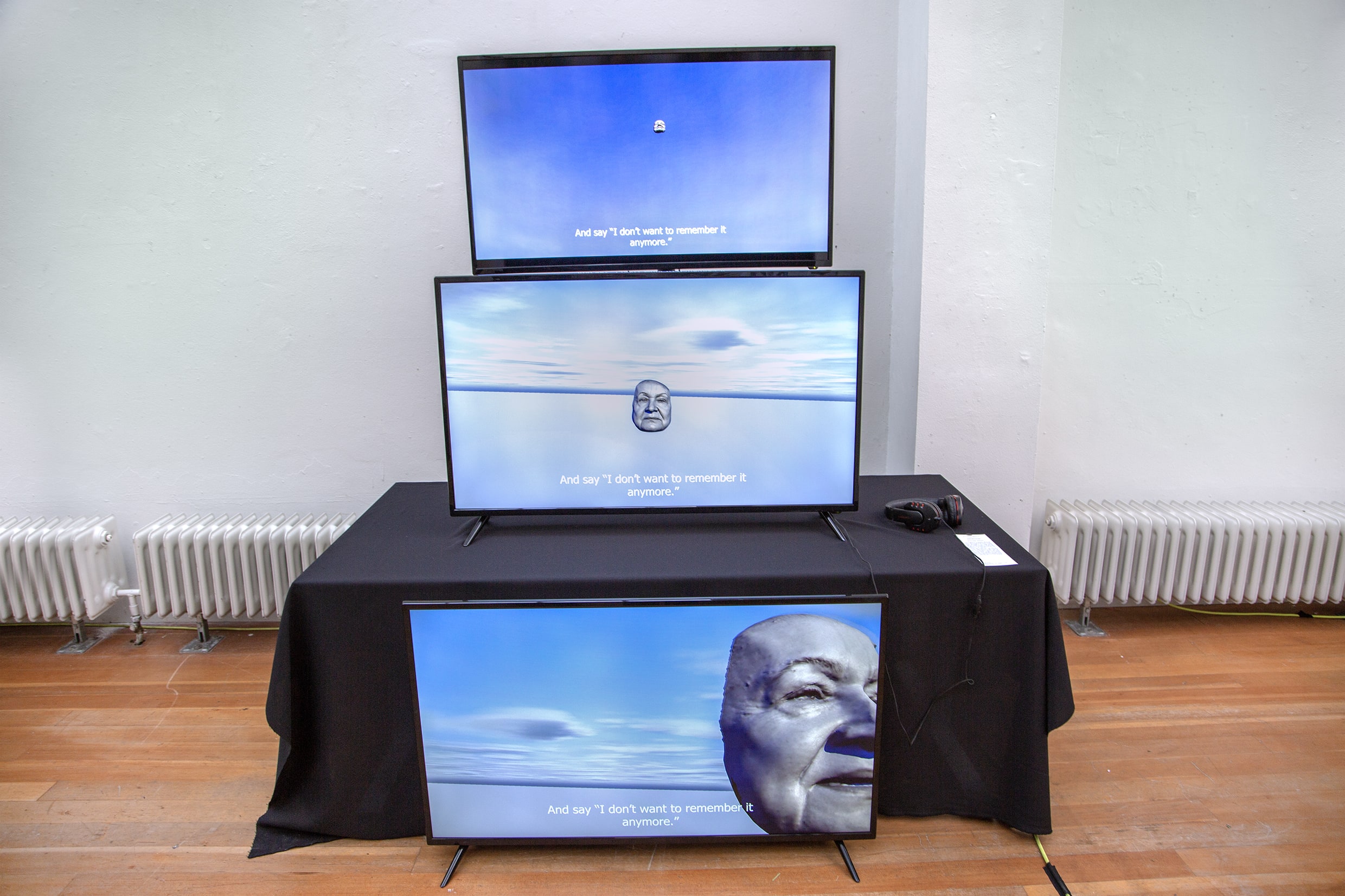 In ‘Abandonment’ Cywoniuk explores her roots in relation to abandonment and trauma, which is present in her family for several generations. She engages in conversation with her mother and grandmother by creating a digital space. She intends to create a safe space for dialogue despite the physical distance that divides them. She asked her mother and grandmother to 3D scan their faces remotely and united them in the exhibited animation along with her own 3D scanned face.